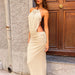 Sculpted for confidence and allure, this floor-length halter gown is your go-to for nights that deserve to be unforgettable. Featuring artful ruching, a dramatic open back, and a slim, elongating silhouette, this dress ensures every entrance is a statement.