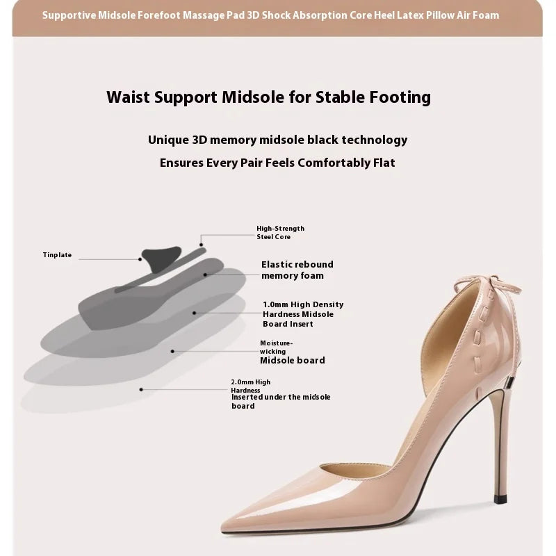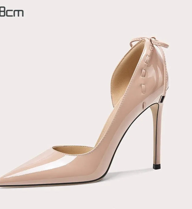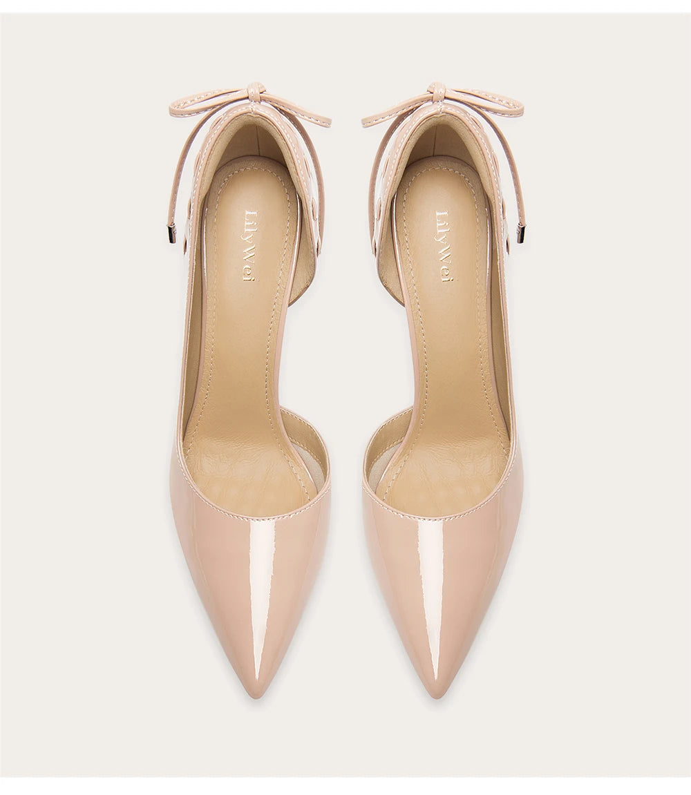Step out with understated elegance in these beige patent pointed stilettos, finished with a dainty butterfly-knot bow at the heel for a modern romantic touch. Crafted for effortless polish and all-day comfort, these slip-on heels are perfect for special occasions, dinner parties, and chic celebrations.