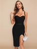 Meet the midi dress that defines sleek sophistication. This sculpted black bandage dress features slender spaghetti straps and a daring side slit, instantly elevating your evening wardrobe. Designed for confident women, it balances modern allure with timeless elegance. Perfect if you need a cocktail dress that hugs curves comfortably while turning heads wherever you go.