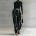 Person wearing a black long-sleeve top and high-waisted pants with white stripes on a neutral background