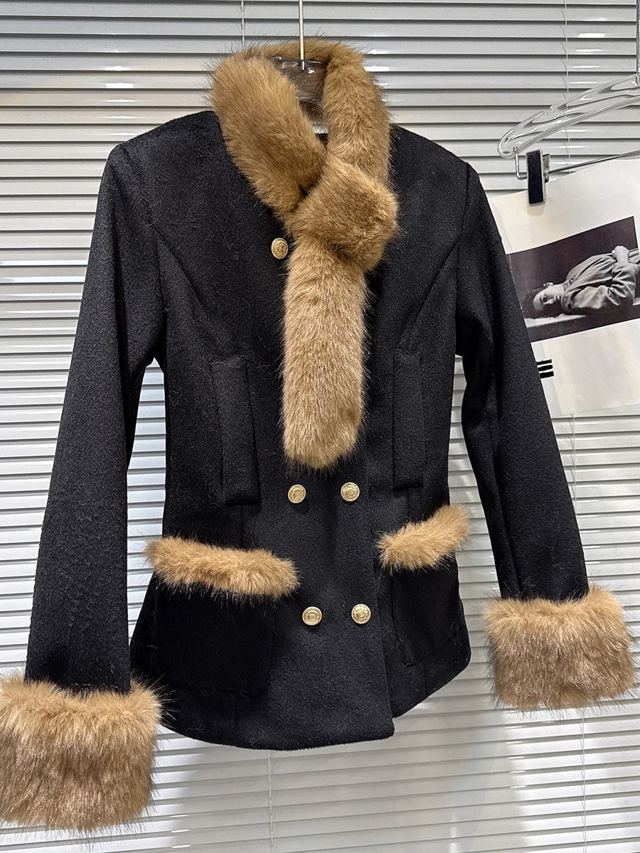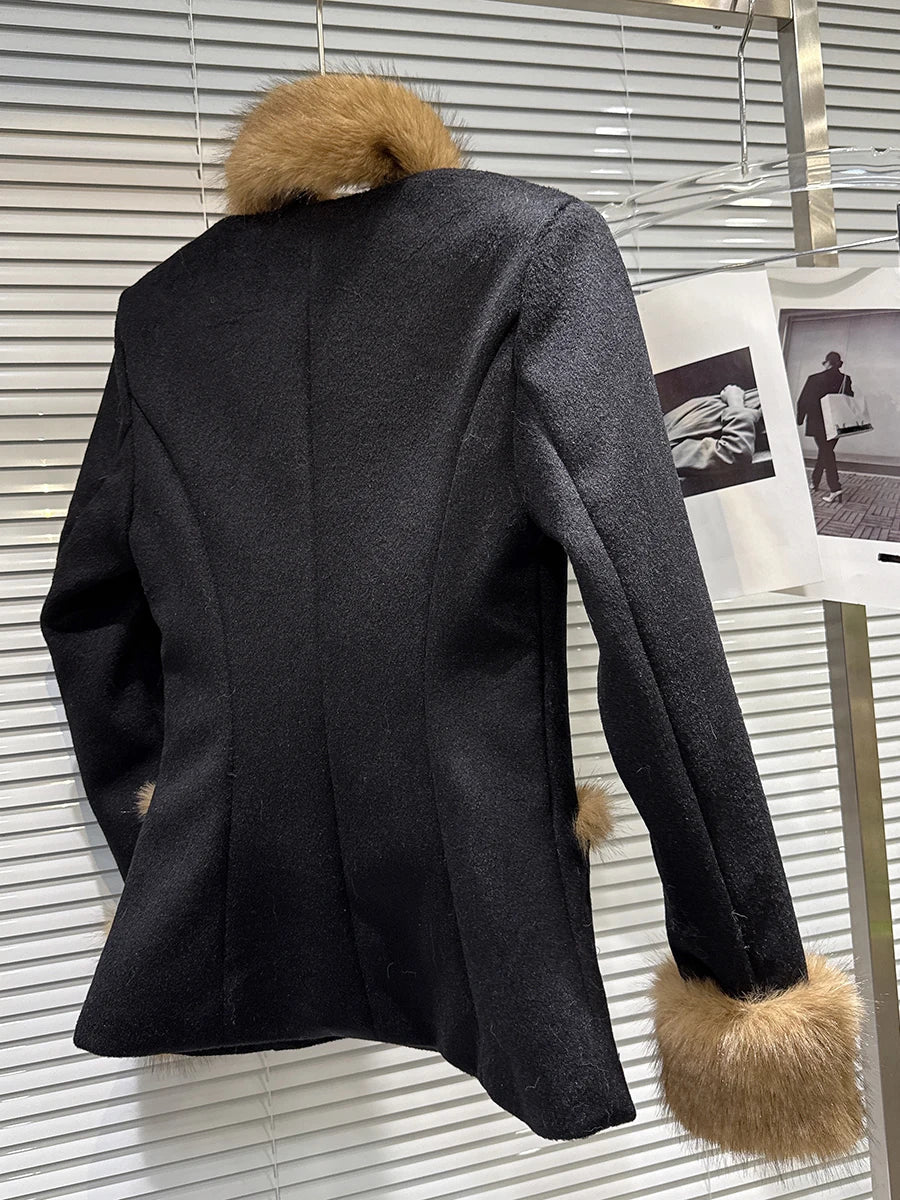 Crafted from premium woven polyester blend with soft inner lining and detailed faux-fur finish. Dry clean only to preserve fabric texture and trim quality.