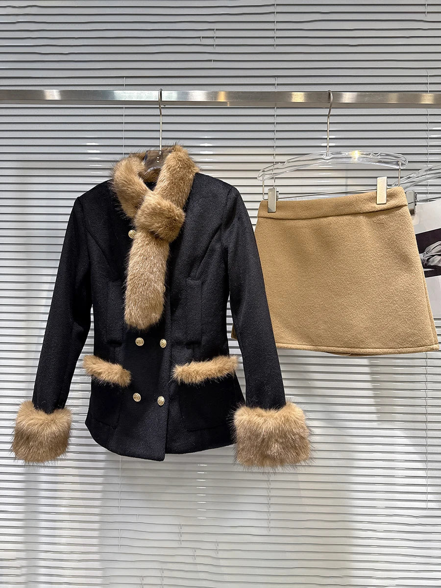 An ode to vintage sophistication — this two-piece set brings warmth and structure into perfect harmony. The tailored black coat, trimmed in rich brown faux fur, pairs with a minimalist mini skirt in matching tone, creating a look that channels 1960s Parisian charm with modern-day precision.