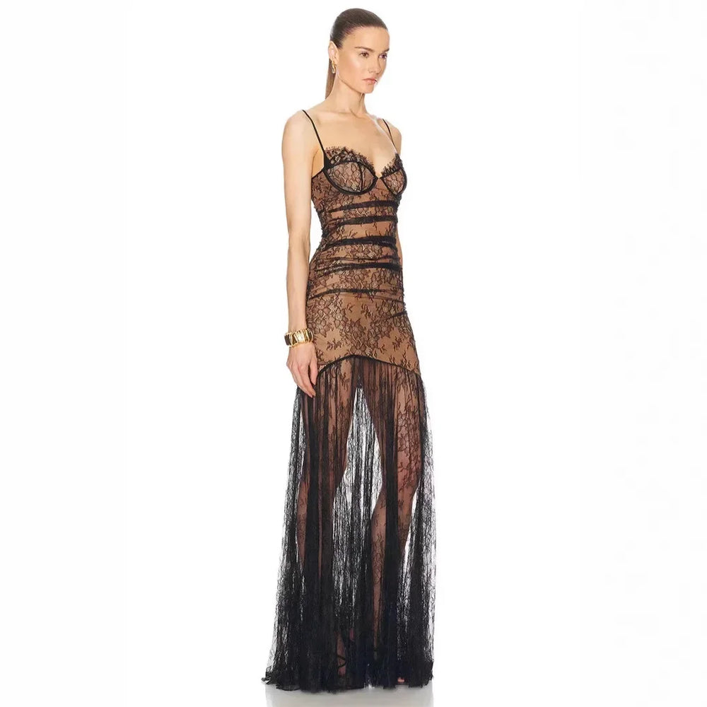 A statement evening gown crafted with layered lace and a fluid sheer overlay that adds depth, dimension, and unexpected drama. The bodycon base sculpts the silhouette, while the soft mesh drapes with a kind of effortless elegance—like smoke wrapping itself around moonlight. Designed for nights when confidence becomes an accessory of its own, this gown brings refined sensuality to every step. This is the piece I reach for when I want a look that feels boldly feminine yet timelessly chic.
