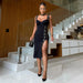 Black midi dress with gold rings and thigh-high slit for cocktail parties