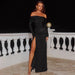 This black off-shoulder high slit maxi dress exudes timeless elegance with a modern, daring twist. Crafted to accentuate the silhouette, it features a sleek sheath fit, soft stretch fabric, and a dramatic thigh-high slit that commands attention. Perfect for evening soirées, galas, and statement occasions.