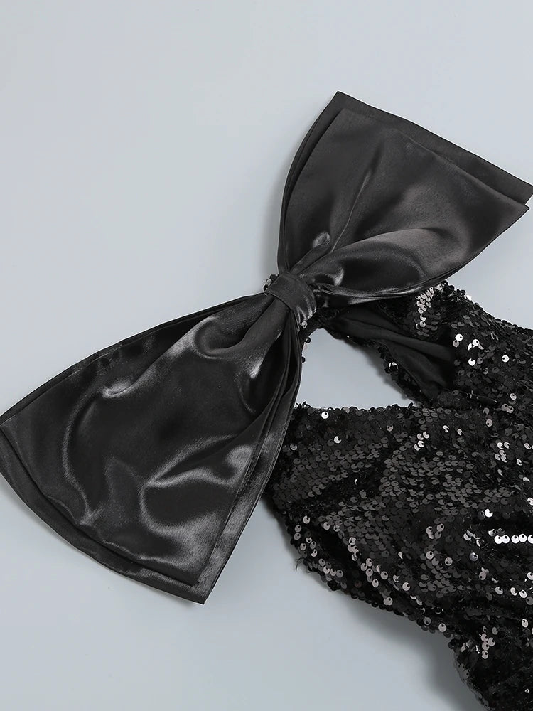 A sleek expression of evening minimalism, this black one-shoulder midi dress is sculpted with a diagonal neckline and a signature bow accent that rests like tailored jewelry. The sequin surface catches light with subtle movement, creating a soft shimmer that feels more architectural than ornate. It’s the kind of dress that whispers presence, rather than announcing it.