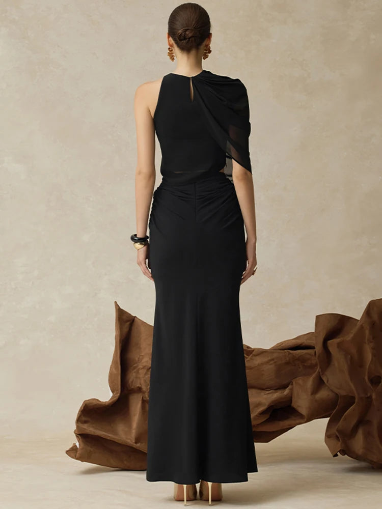 This two-piece set is the definition of modern formal: a one-shoulder top with a sheer sleeve for soft contrast, paired with a sleek maxi skirt that falls into a subtle mermaid line. The look is sculpted but not loud—clean fro