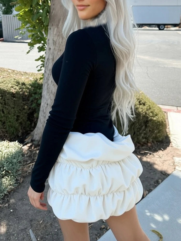 A sculpted black-and-white mini dress that blends minimalist tailoring with a soft, voluminous hem. The deep V-neckline, slim long sleeves, and tiered puff skirt create a striking modern silhouette—polished enough for evenings out, yet playful enough for city style. Clean lines meet architectural texture in a piece made to stand out without trying.