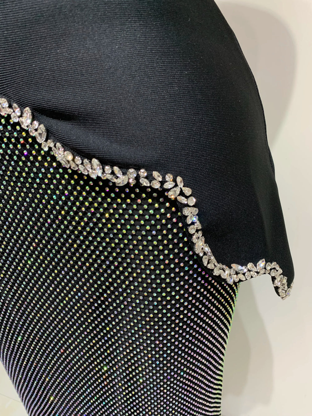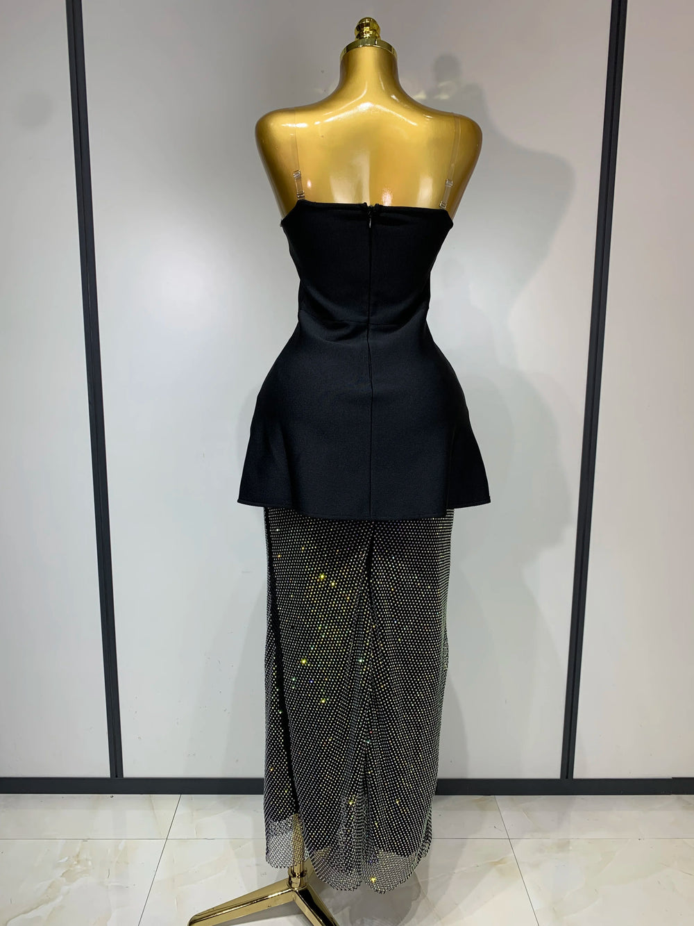 Make a dazzling statement in this Black Rhinestone Corset Top & Sequin Skirt Set. Designed for the sophisticated adult female, this two-piece ensemble is perfect for parties, carnivals, and glamorous events. It features a sleeveless corset top intricately embellished with shimmering rhinestones, paired with a matching sequin skirt that reaches ankle-length. Crafted from a knitted fabric of polyester and spandex with high stretch, this set offers a slim fit and a sleek sheath silhouette, ensuring a flattering and comfortable wear. With its alluring strapless neckline and convenient zipper closure, this solid patterned outfit ensures you radiate elegance in All Seasons.
