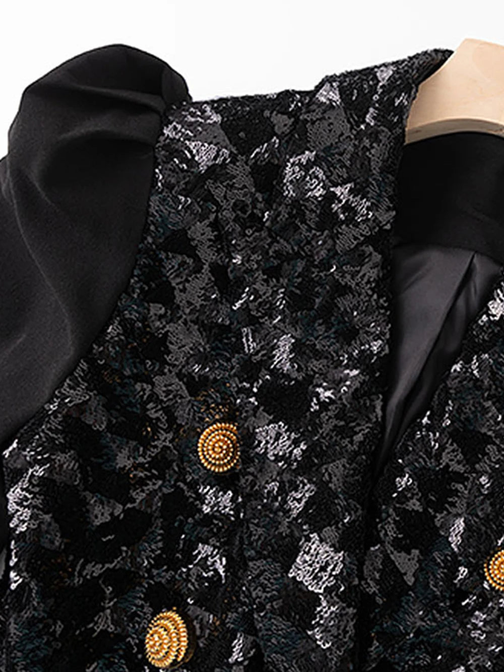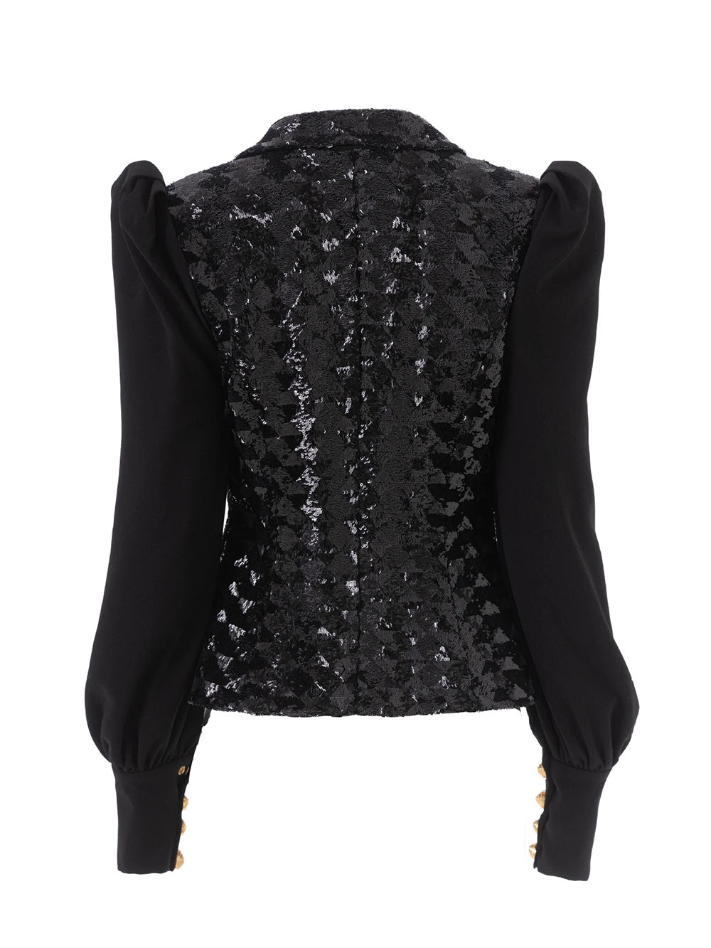 This blazer arrives with attitude — not loud, but unmistakably poised. The black sequin body catches light in quiet fragments, while the gold double-breasted buttons frame the structure with a touch of polished heritage. Crafted with a defined waist and lantern sleeves, it softens strong tailoring with sculptural movement, like architecture draped in twilight shimmer. This is the piece I reach for when I want glamour built on structure, not sparkle alone.