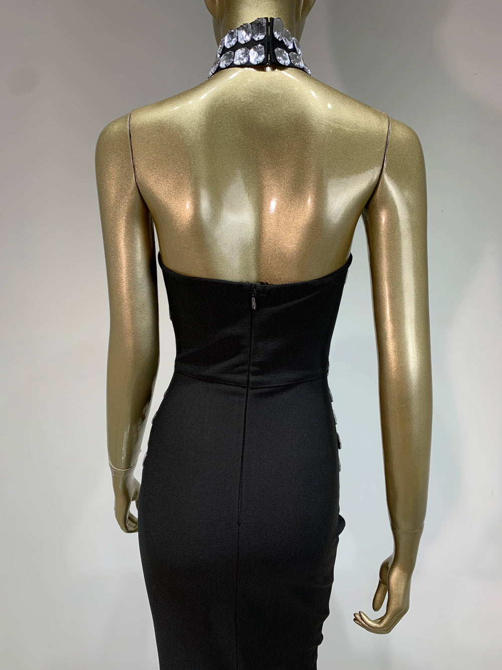 Radiate sophistication in this stunning Black Strapless Beaded Maxi Dress. Designed for the adult female, this elegant gown features exquisite beading that beautifully complements its sleek, strapless neckline. Crafted from a polyester and spandex knit fabric with high stretch, this floor-length Dress offers a slim fit and a graceful sheath silhouette that drapes elegantly. Perfect for special occasions and evening events, its timeless black color ensures a refined and glamorous look.