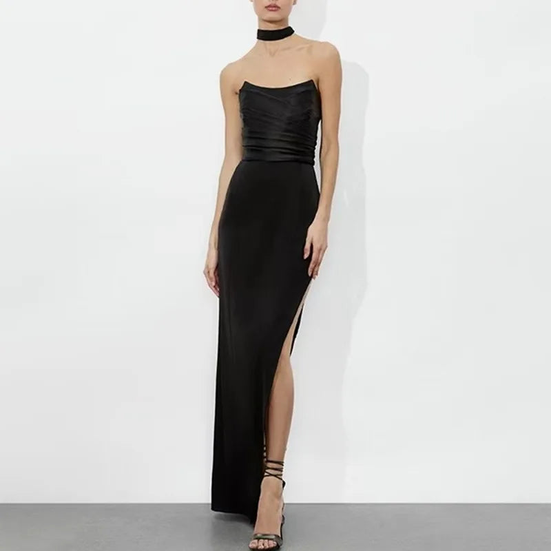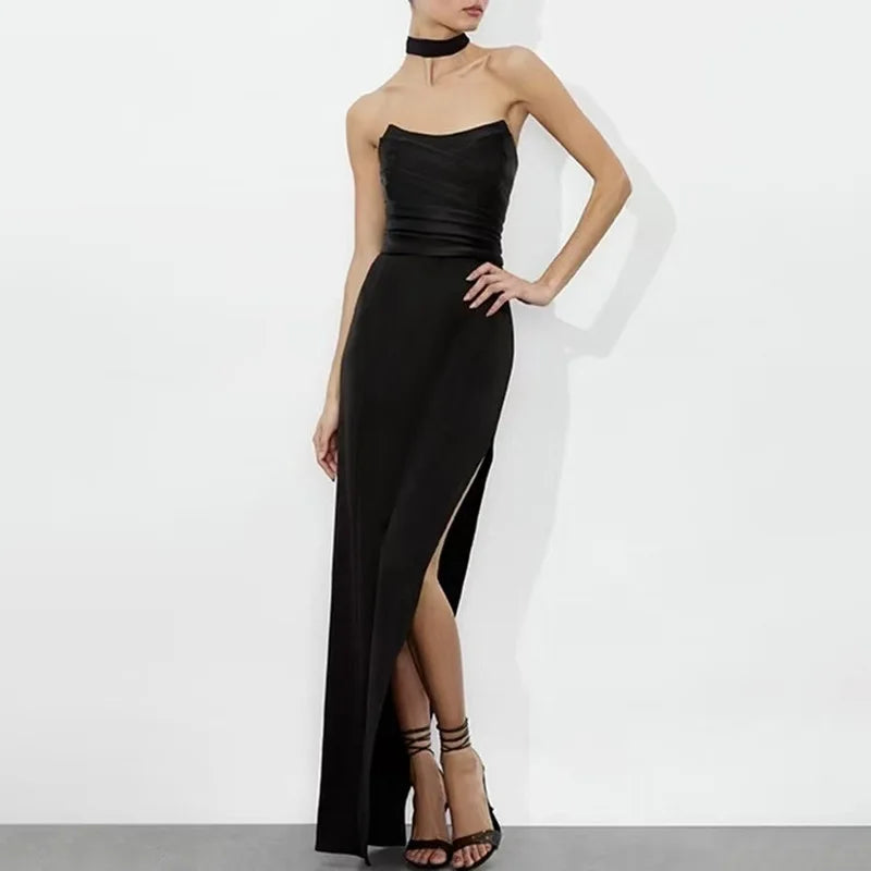 Make a memorable entrance in this black strapless gown, designed with a sleek silhouette and daring thigh-high slit for effortless sophistication. The soft stretch jersey hugs every curve, while the minimalist neckline and dramatic side slit offer both elegance and striking appeal. Perfect for formal events, cocktail parties, or upscale dinners—this dress is made for those searching for a timeless “black strapless gown with high slit” that blends classic glamour with a modern edge.