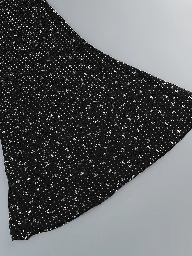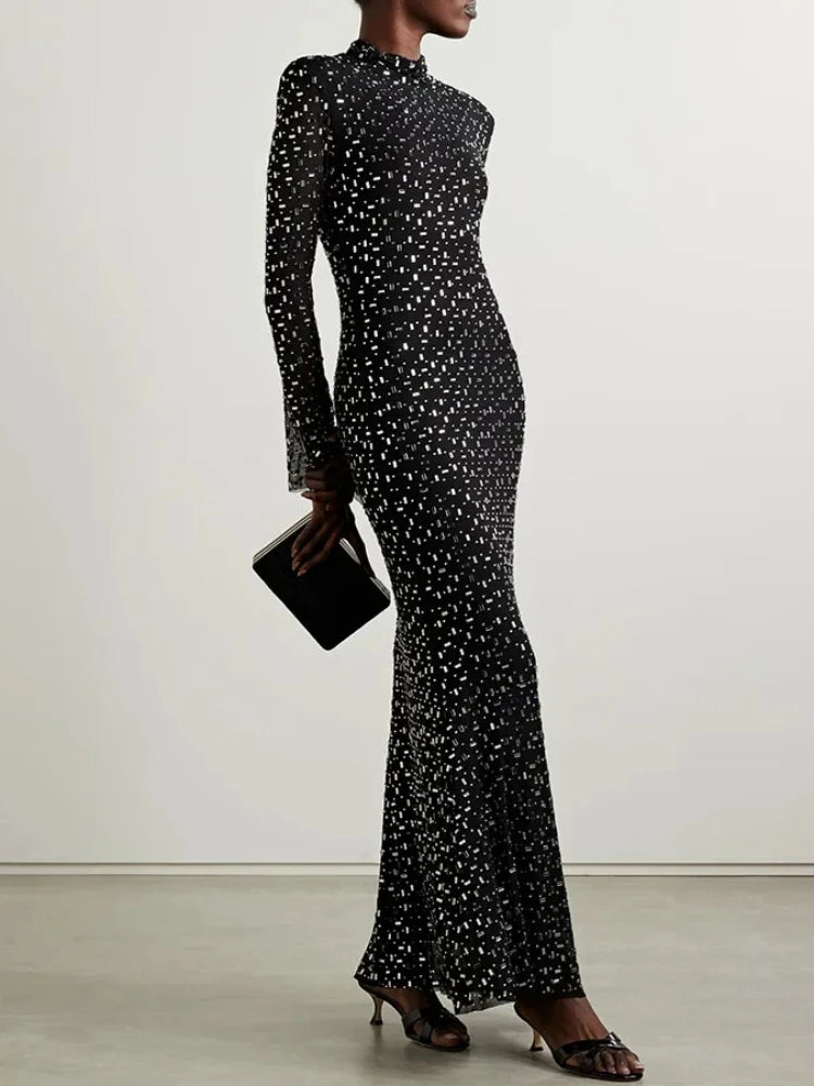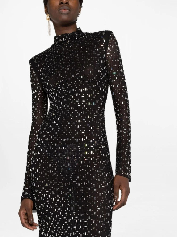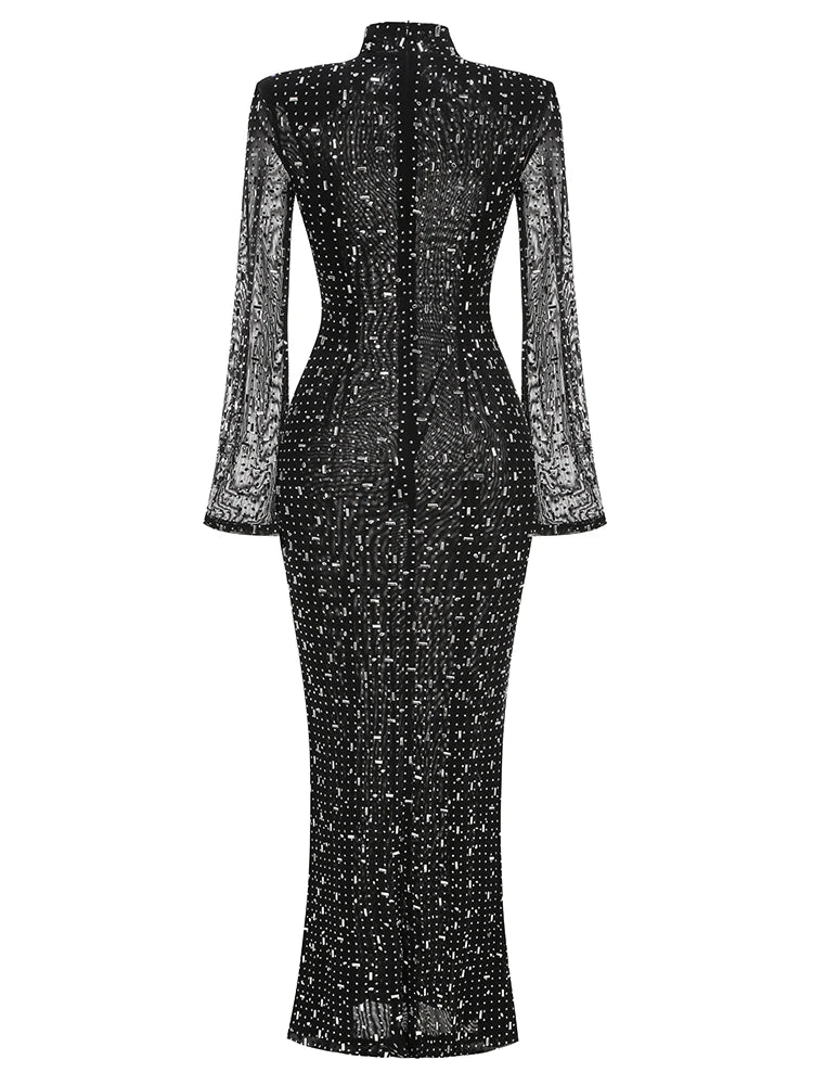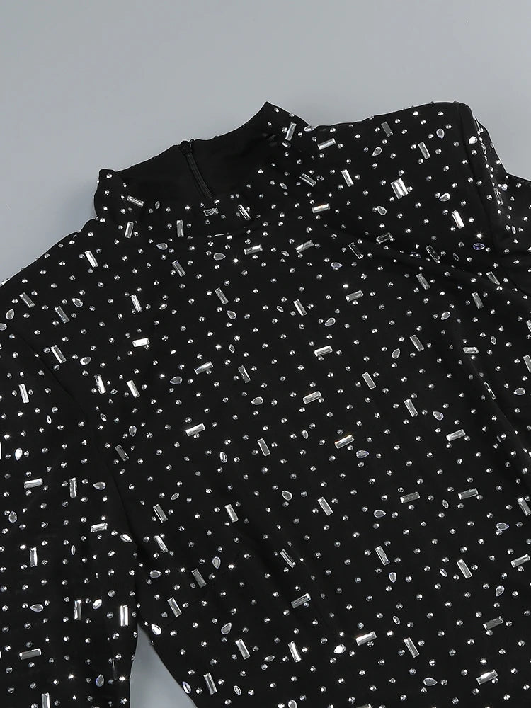 Make a dazzling entrance in this Black Turtleneck Mesh Diamond Long Sleeve Gown. Designed for the sophisticated adult female, this stunning evening dress features an elegant turtleneck and captivating mesh details adorned with bright rhinestone and crystal diamond beads. Its full, flared sleeves add a dramatic touch, while the mid-calf length and slim sheath silhouette create a flattering fit.