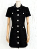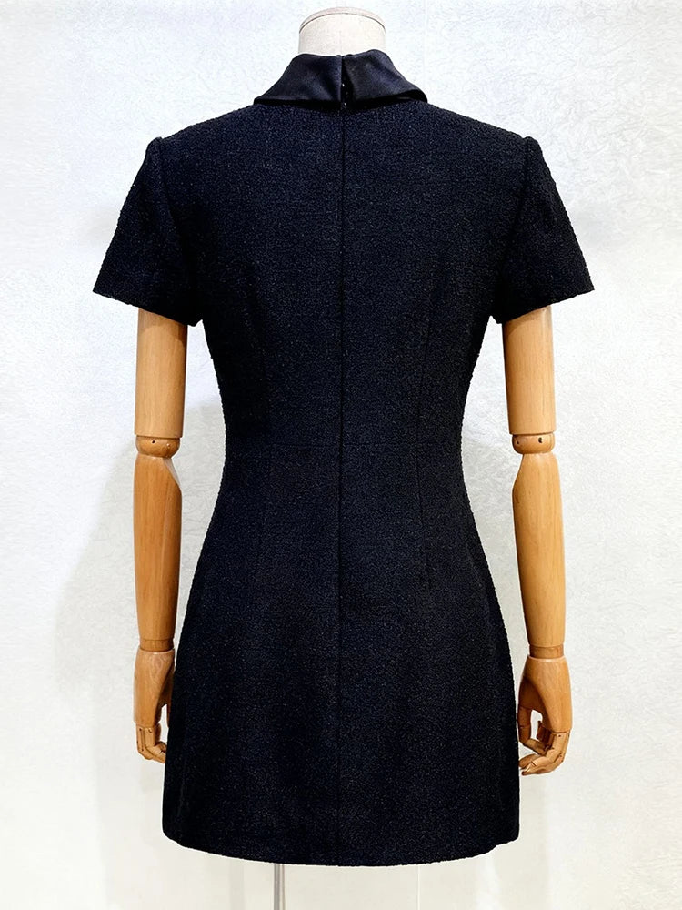 A tailored mini dress crafted to feel polished, sculpted, and distinctly elevated. The black tweed texture brings subtle dimension, while the diamond-style buttons add a refined touch of sparkle without drifting into excess. The silhouette is clean and confident, moving with the steady poise of timeless tailoring—like a structured silhouette carved from soft shadow. This is the piece I reach for when I want sophistication with a hint of understated glamour.