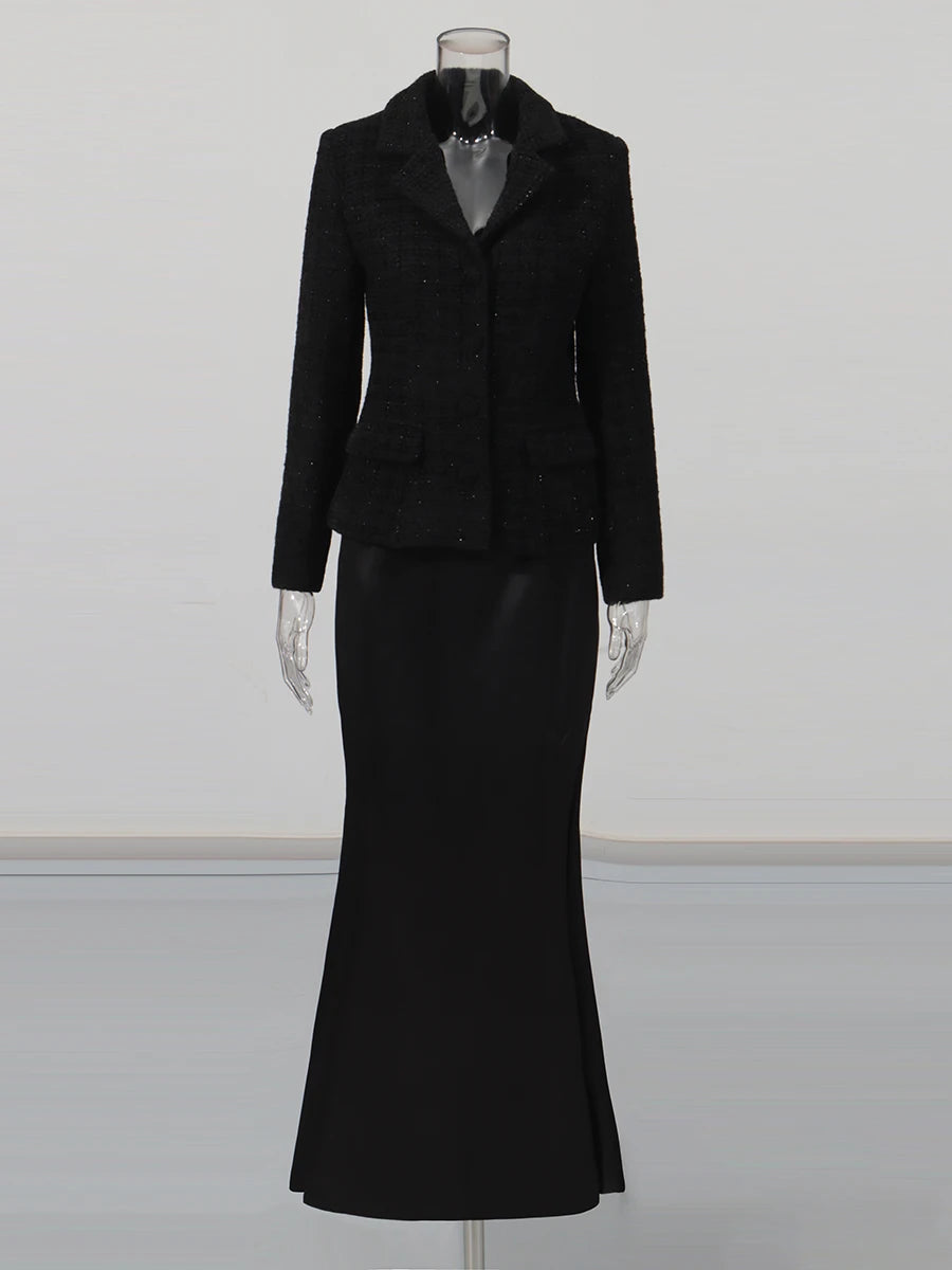 A two-piece set that blends sharp tailoring with fluid evening elegance. The black tweed blazer sculpts the waist with a clean, structured line, while the satin mermaid skirt slips into motion with a soft, liquid sheen. The contrast of textures feels effortlessly elevated — like pairing discipline with desire in one single look. This is the piece I reach for when I want an outfit that feels powerful yet undeniably feminine, perfect if you’re looking for a black two-piece set that transitions from evening dinners to special events with ease.