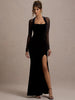 A timeless silhouette reborn in velvet. This square-neck maxi dress pairs the softness of black velvet with sheer mesh sleeves for a sleek, sculpted finish. The thigh-high slit adds movement and allure — a dress that whispers elegance while making a statement.