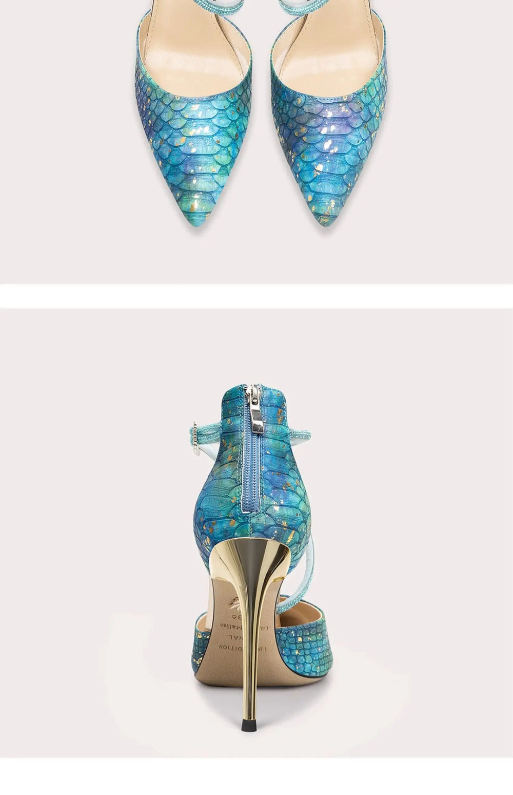 Make an unforgettable entrance in these blue crystal-embellished stilettos, featuring an iridescent PU upper, sparkling ankle strap with heart charm detail, and a luxe gold thin heel for radiant elevation. The pointed toe and covered heel combine comfort and statement style, perfect for glamorous nights, proms, or anytime you want to shine.