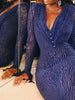 A sweeping blue maxi dress crafted for evenings that call for drama, elegance, and a little mystery. The sheer knit, fluid animal-print texture, and deep V-neck create a silhouette that glides over the body with effortless movement. The way the fabric catches light feels almost aquatic — like wearing a ripple of midnight water. This is the piece I reach for when I want something bold yet refined, perfect if you’re looking for a blue sheer maxi dress that defines event-ready confidence.