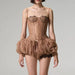 Turn heads in this brown corset and ruffled mini skirt set—a standout look for parties, photoshoots, or fashion-forward events. The structured bodice sculpts your silhouette, while the soft layered skirt brings playful volume and movement. Perfect if you're searching for a dramatic two-piece outfit with a runway-inspired edge.