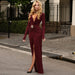 Make an entrance this autumn in the burgundy V-neck slit gown—a showstopping dress for women who love elegance with a dramatic twist. The body-skimming, asymmetrical silhouette and deep V neckline frame the figure, while a high side slit adds bold movement and a modern edge. Designed for galas, formal dinners, and high-profile celebrations, this gown is perfect if you're searching for a “burgundy long sleeve gown with high slit for autumn events.”