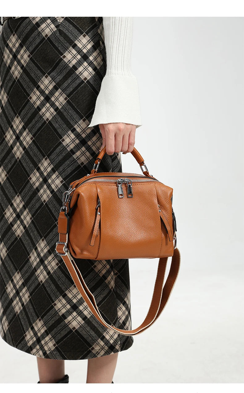 A refined satchel-style bag crafted in genuine cowhide leather, designed to move effortlessly between shoulder and crossbody wear. Clean lines, a structured top handle, and a secure zip closure make it an elegant everyday piece with a polished, understated finish.