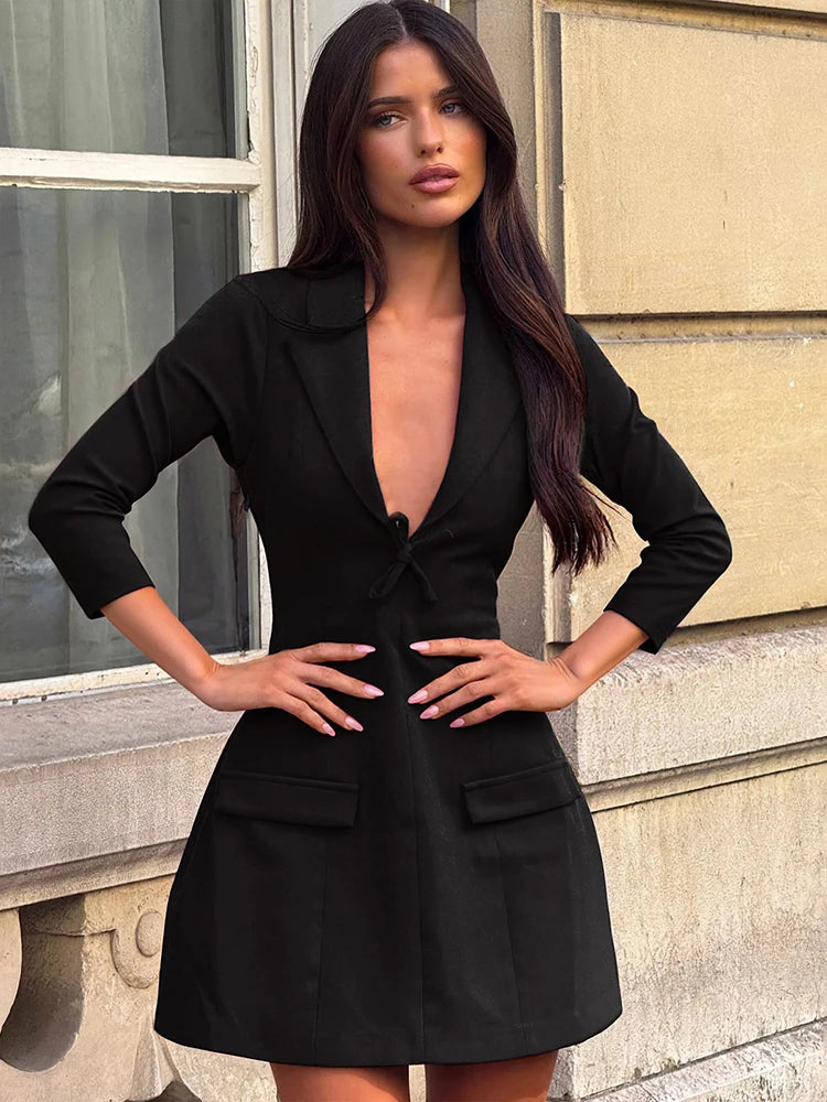 Sharp tailoring meets soft femininity in this blazer-inspired mini dress. Its deep V-neckline and subtle bow accent bring a hint of allure to a timeless silhouette, creating that perfect balance between power and poise. This is the piece I reach for when I want to feel in control — and completely at ease.