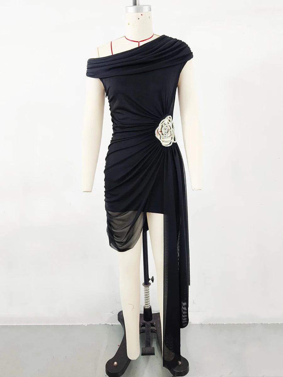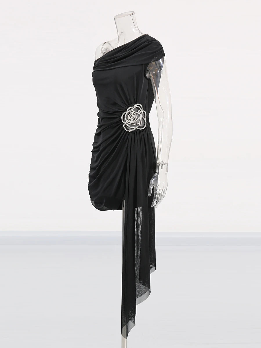 Designed with a touch of cinematic glamour, this mini dress blends vintage structure with a fluid sculpted drape. The diagonal collar subtly frames the neckline, while the hollow-out side detail adds lightness to its tailored form. It feels like wearing contemporary architecture — refined, confident, elegantly undone.