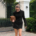 Person wearing a black button-up dress holding a brown jacket on a brick pavement.
