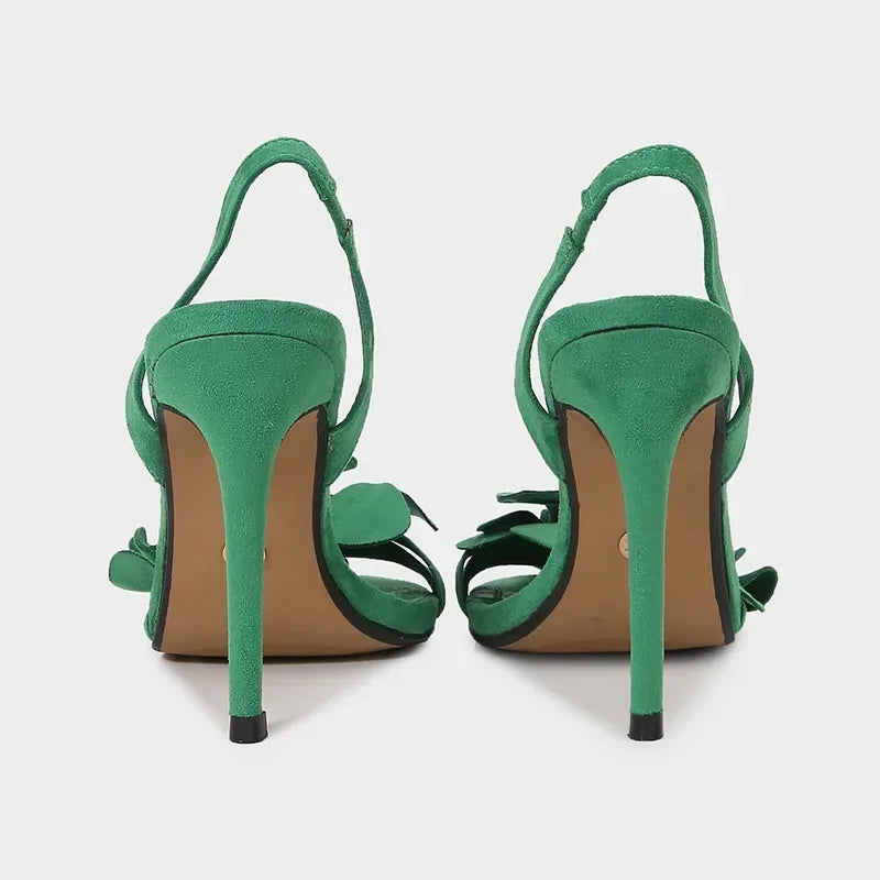 These elegant sandals bring luxury design and serious glamour to any party, wedding, or evening outfit. A vivid green crystal flower detail sits atop an ultra-high, thin heel for maximum visual impact. The pointed toe and open vamp create a leg-lengthening effect, ideal for modern brides, guests, or anyone seeking standout footwear for Summer 2025.