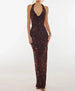 A full-length shot of the ankle-length floral halter gown.