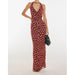 Woman wearing a black and red patterned halter neck dress on a white background