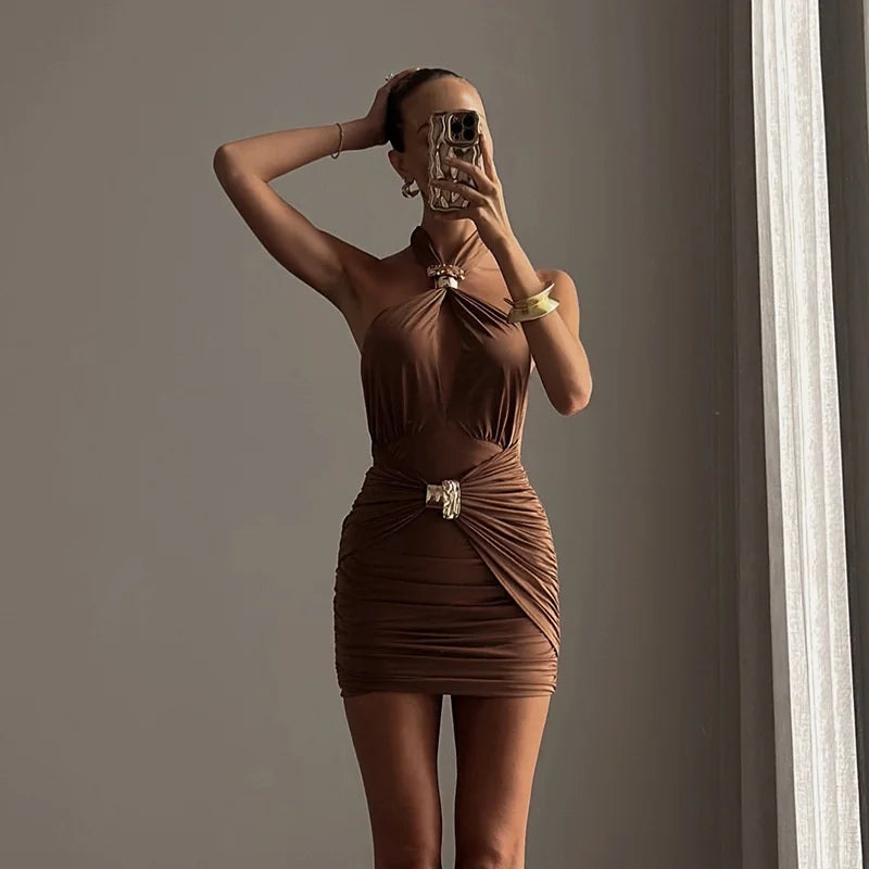 This mini dress is made for nights that start with a mirror selfie and end somewhere unforgettable—halter neckline, a sleek keyhole cut, and ruched shaping that hugs in all the right places. Finished with polished metal buckle details, it delivers a sculpted, high-impact silhouette with minimal effort. Voice-search phrase: “what mini dress should I wear for a club night?”