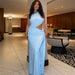Step into sky-high elegance with this light blue asymmetric maxi dress—crafted for women who want to channel effortless glamour at coastal events, evening gatherings, or destination getaways. The artful diagonal collar and sculpted waist cut-out offer modern allure, while the fluid, milk fiber-inspired knit shimmers in every movement. Perfect if you're searching for “What’s a statement light blue dress for beach parties or autumn evenings?”—combining comfort, style, and head-turning design.