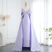 A woman wearing an elegant lilac off-shoulder mermaid gown with a flowing cape overskirt.