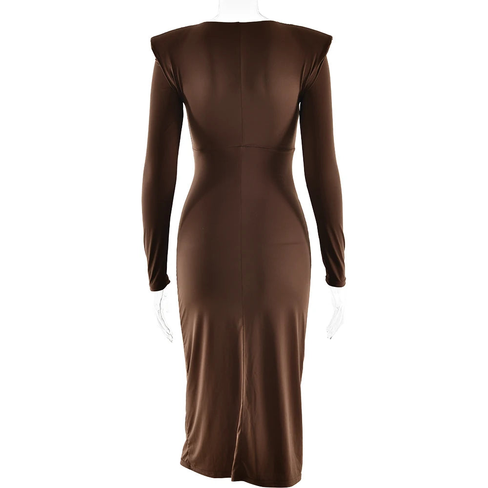 A sculpted long-sleeve maxi dress designed with clean shoulder structure, soft front draping, and a signature metal detail at the waist. The silhouette flows like poured satin holding its shape, creating a refined, elongated look from every angle. This is the dress I choose when I need quiet power with undeniable elegance.