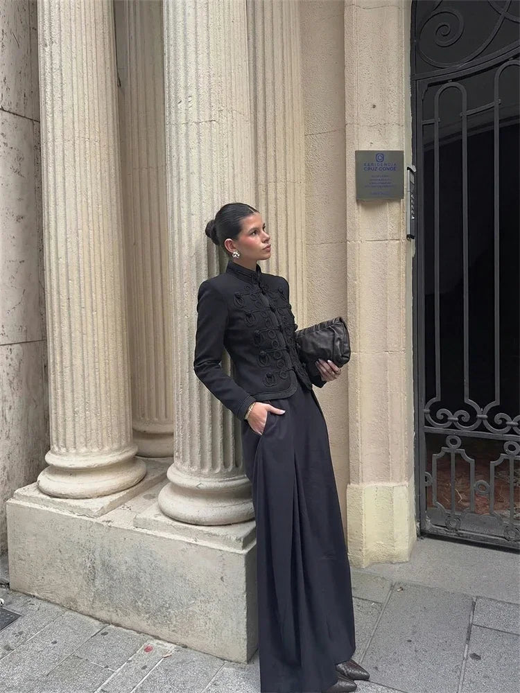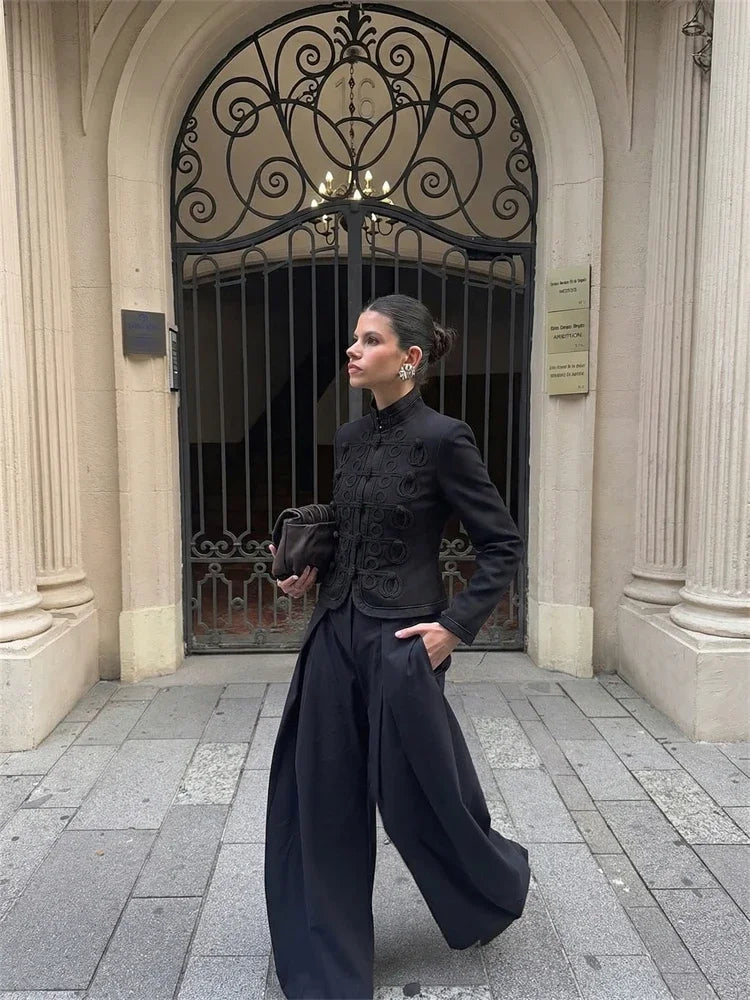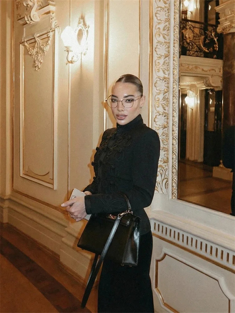 Style it with wide-leg trousers for office polish, or pair with a midi skirt and heels for dinners and events. For a modern city look, wear it with denim and a sleek shoulder bag. The mandarin collar frames the face beautifully—keep jewelry minimal and let the texture do the work.