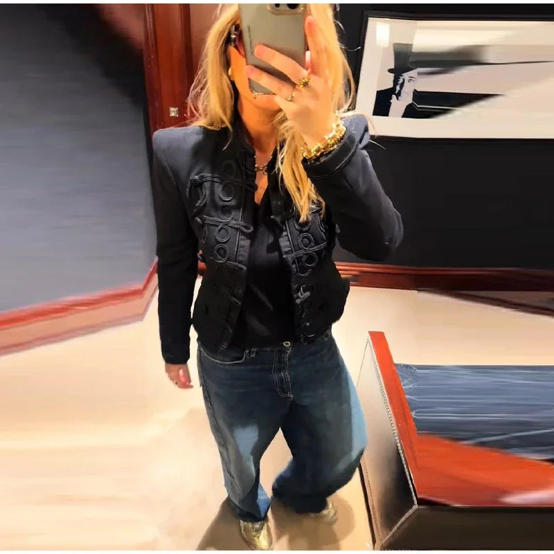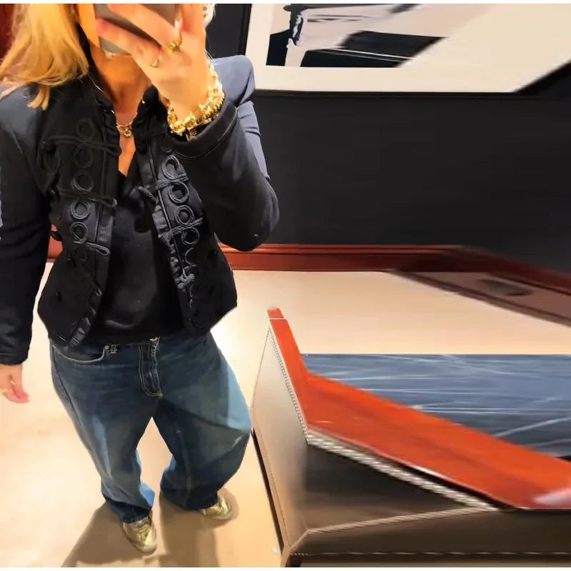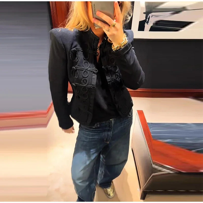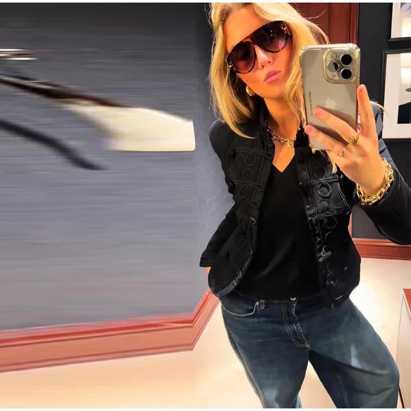A tailored blazer with a sleek mandarin collar and sculpted pattern detailing that reads polished from every angle. The close-to-the-body shape defines the waist, while the statement front texture adds depth without needing extra accessories. “what blazer looks chic for work and dinner” is the exact vibe this piece delivers (as photographed in black with tonal raised detailing).