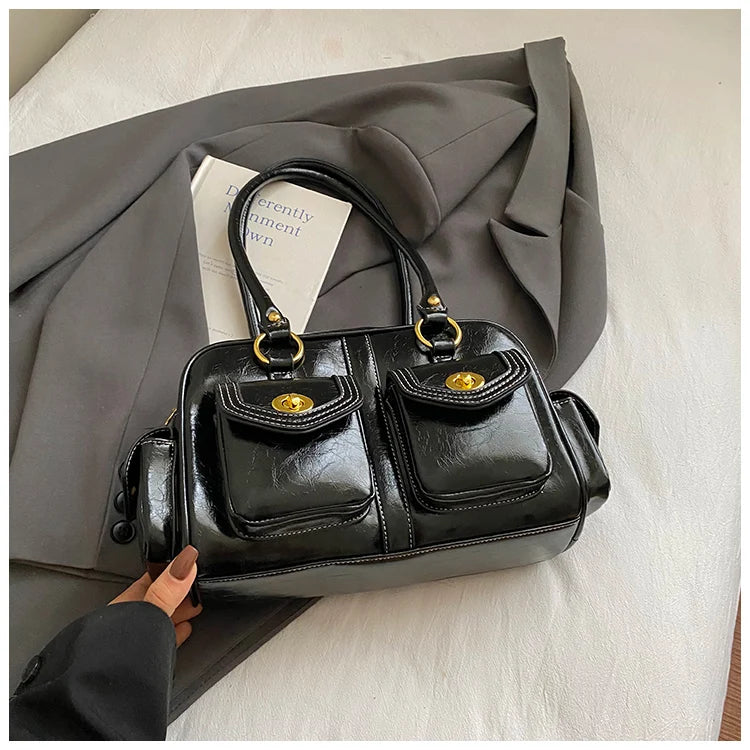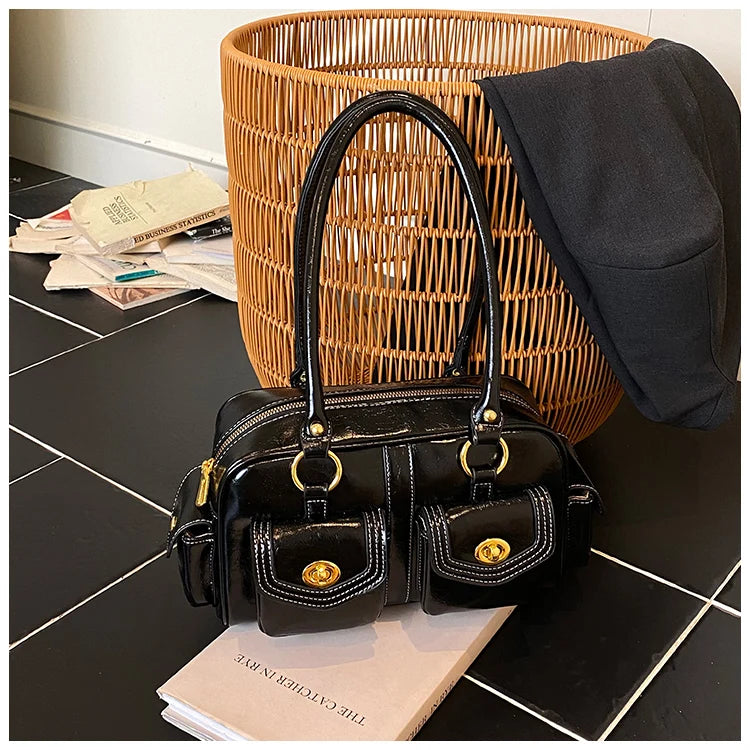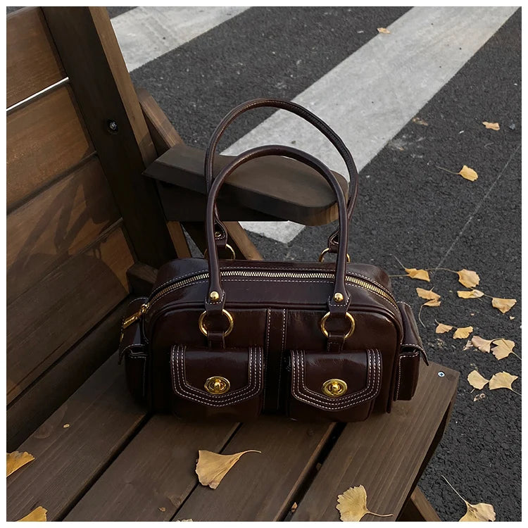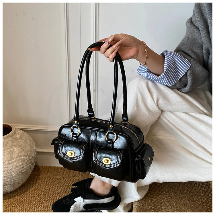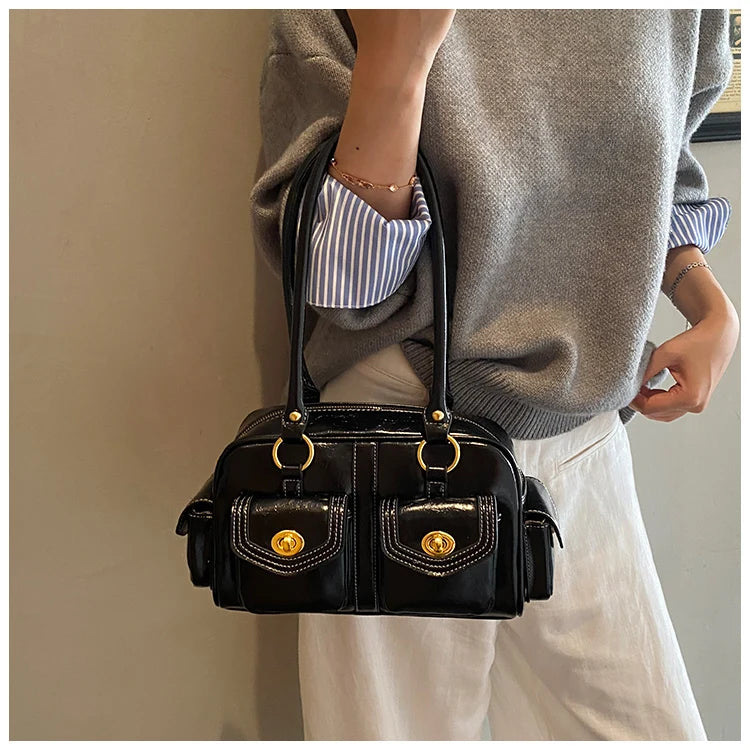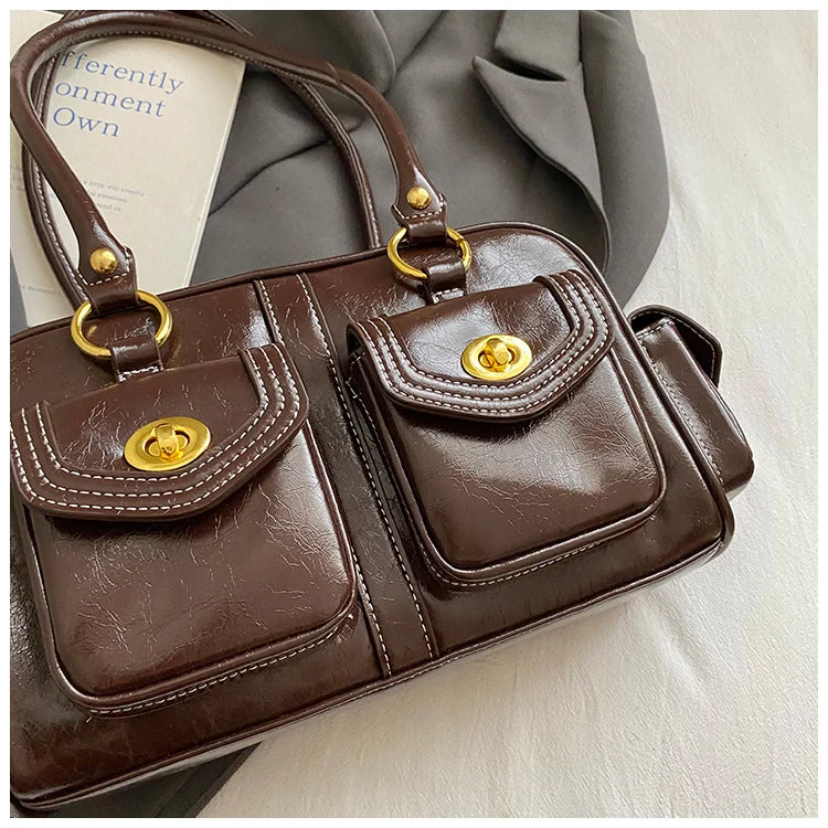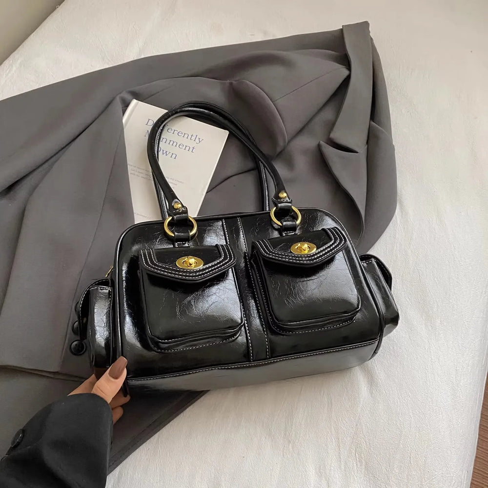 A retro-chic nod to early 2000s fashion, this structured satchel blends timeless form with a touch of modern polish. Crafted from premium microfiber synthetic leather, it offers a soft sheen and durable build without the upkeep of real leather. Featuring dual front flap pockets with gold turn-lock hardware and a secure zip closure, it’s the perfect mix of functionality and style. Carry it by the top handles or over the shoulder for an effortlessly elevated look that works from café mornings to evening plans.