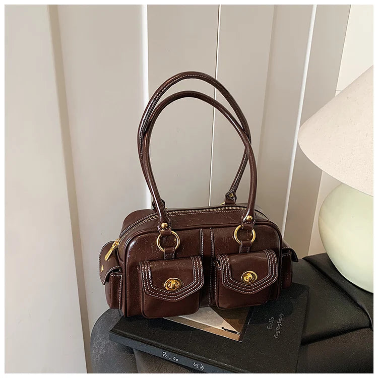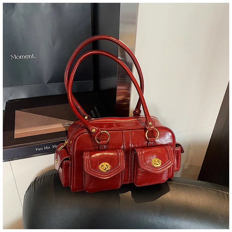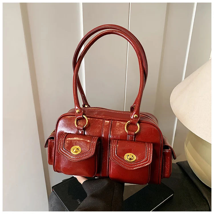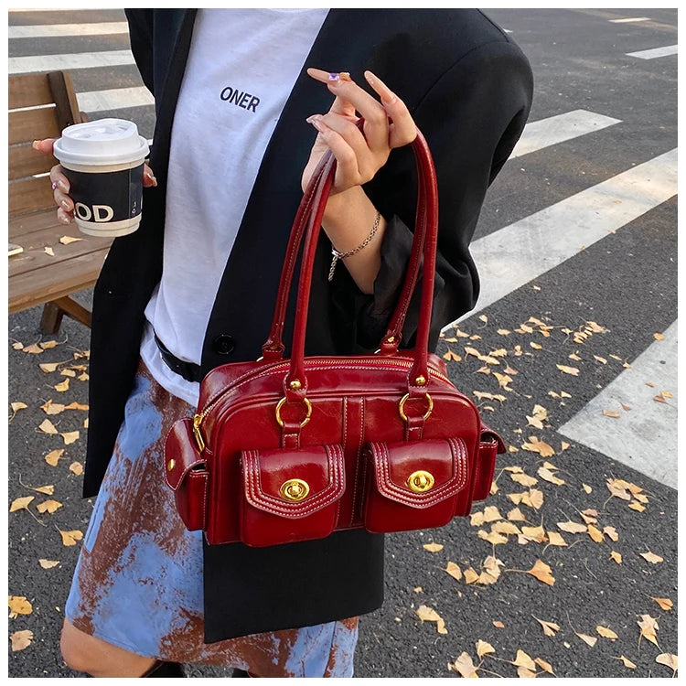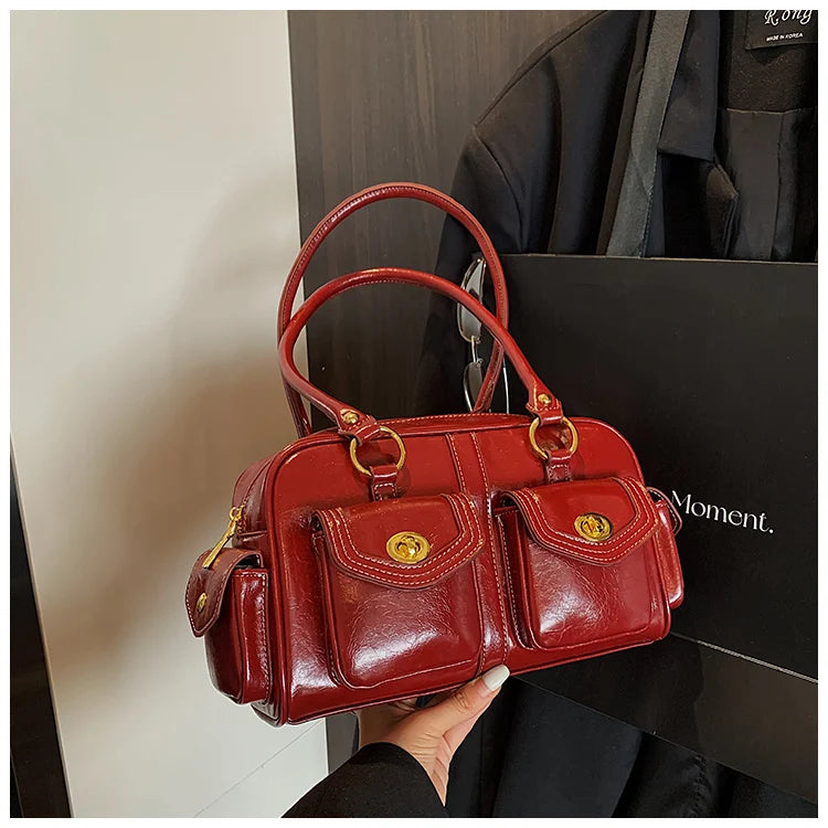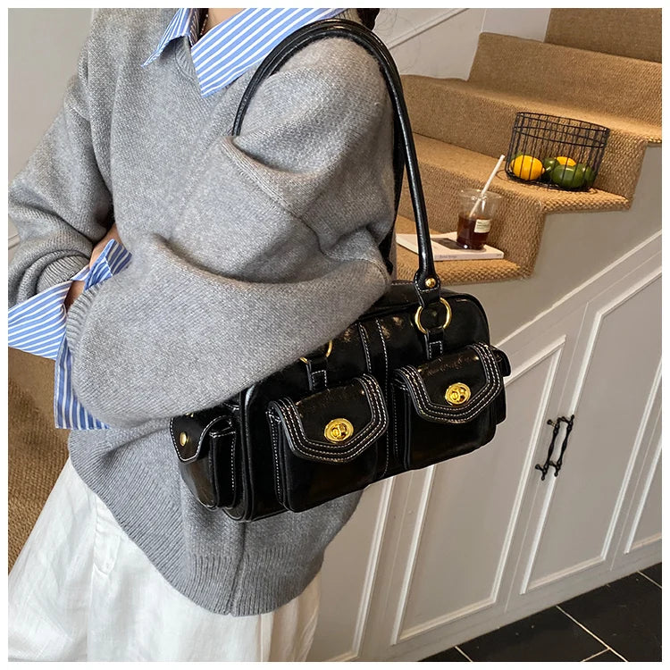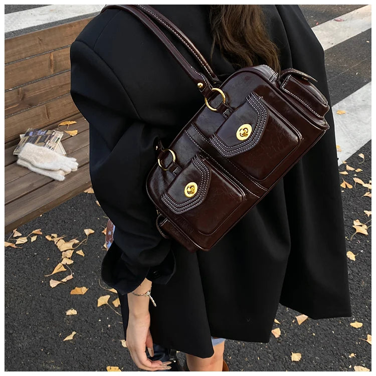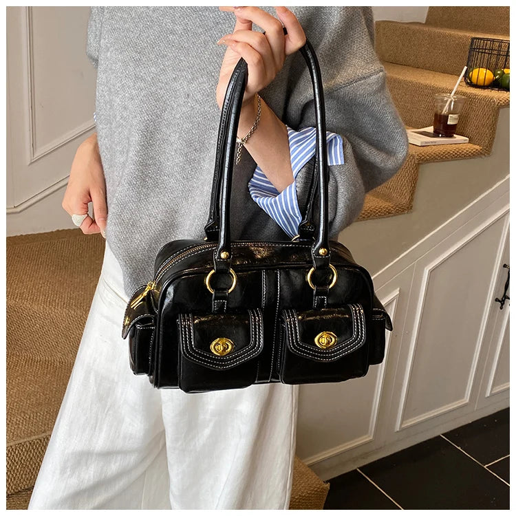 A retro-chic nod to early 2000s fashion, this structured satchel blends timeless form with a touch of modern polish. Crafted from premium microfiber synthetic leather, it offers a soft sheen and durable build without the upkeep of real leather. Featuring dual front flap pockets with gold turn-lock hardware and a secure zip closure, it’s the perfect mix of functionality and style. Carry it by the top handles or over the shoulder for an effortlessly elevated look that works from café mornings to evening plans.