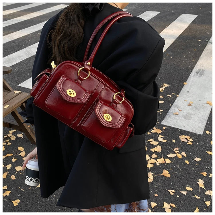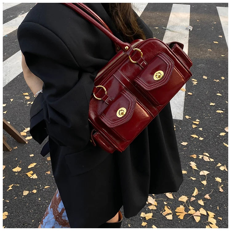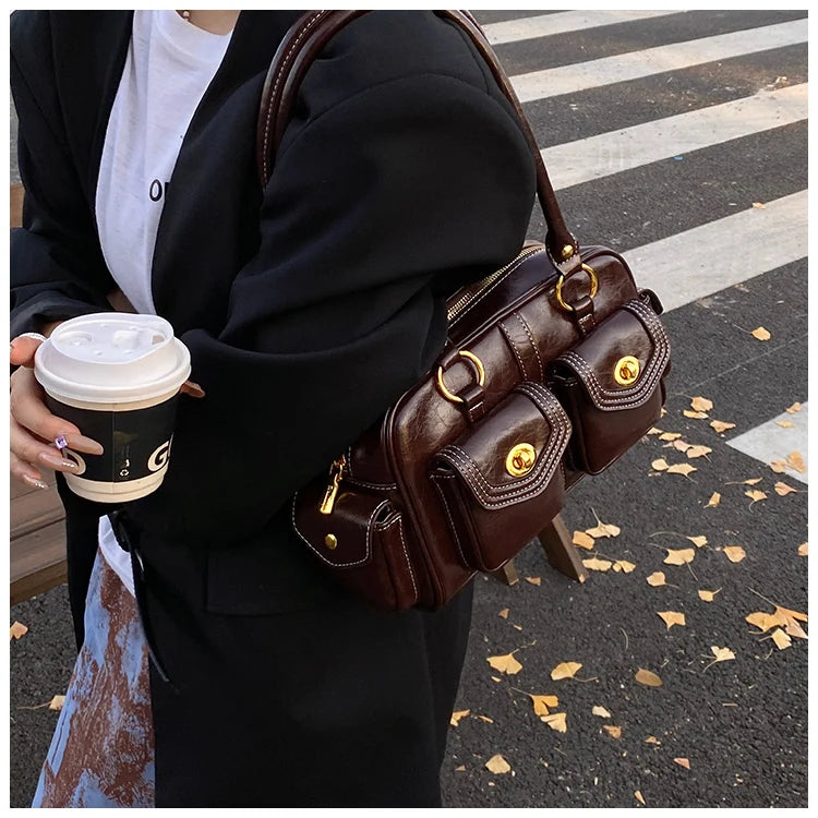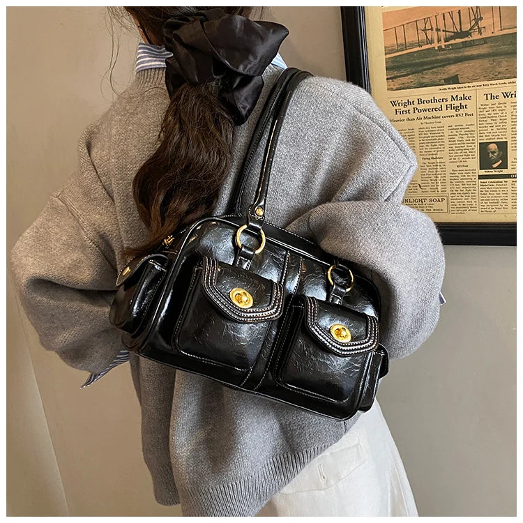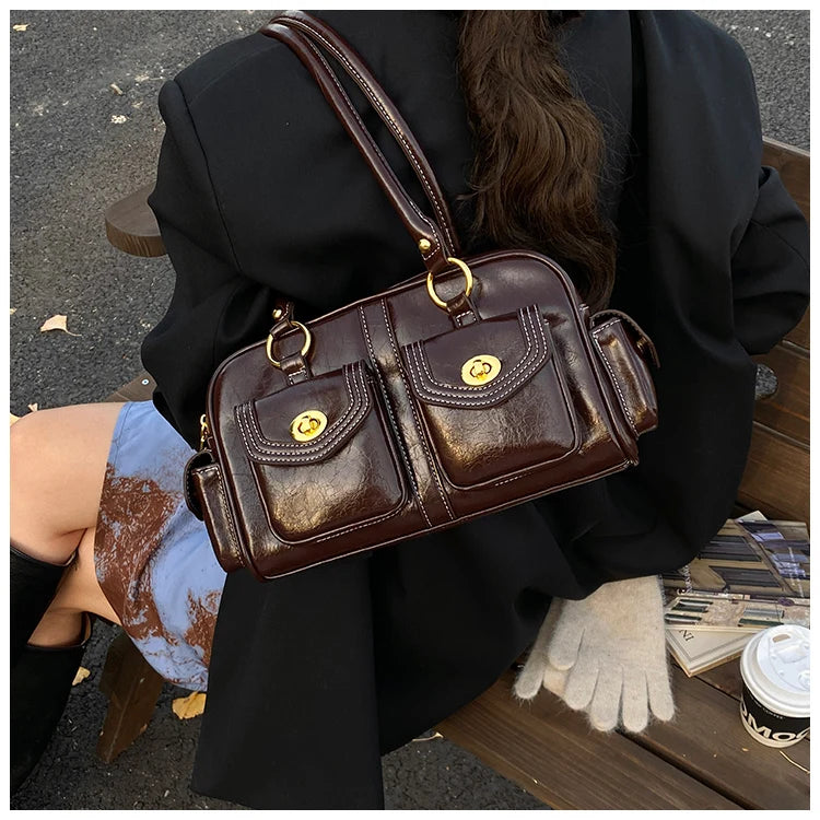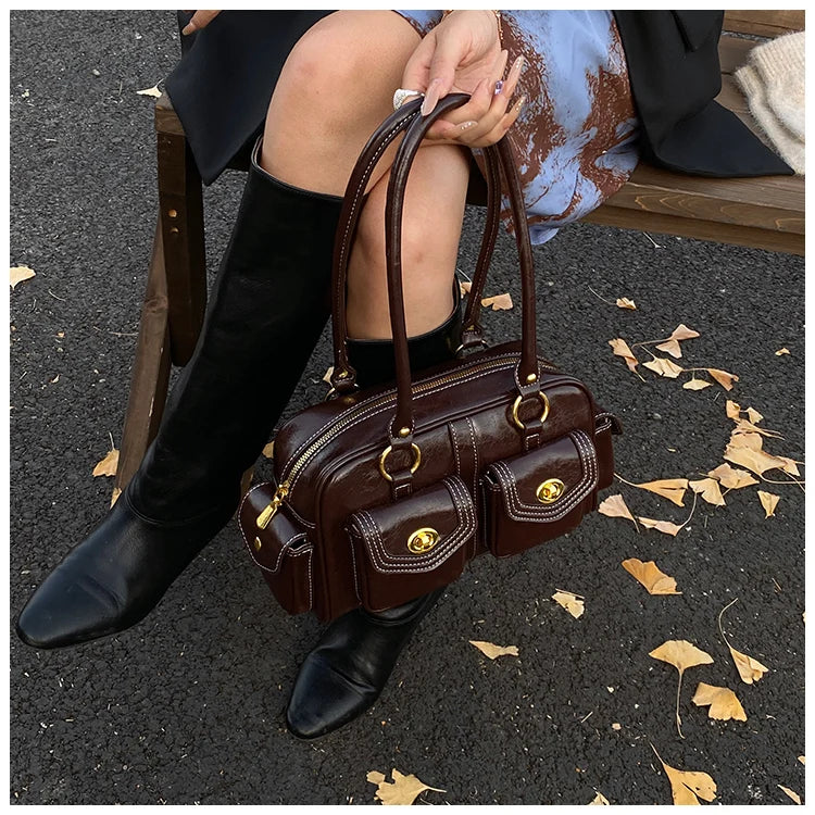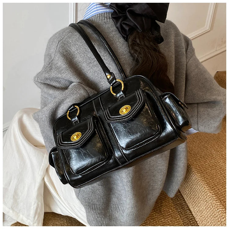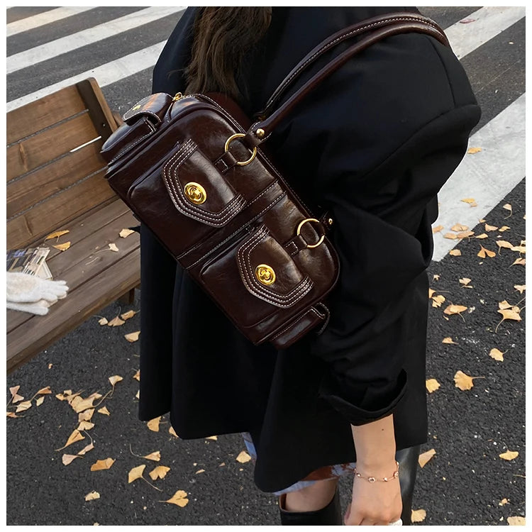 A retro-chic nod to early 2000s fashion, this structured satchel blends timeless form with a touch of modern polish. Crafted from premium microfiber synthetic leather, it offers a soft sheen and durable build without the upkeep of real leather. Featuring dual front flap pockets with gold turn-lock hardware and a secure zip closure, it’s the perfect mix of functionality and style. Carry it by the top handles or over the shoulder for an effortlessly elevated look that works from café mornings to evening plans.