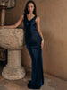 Turn every entrance into a statement with this navy blue cowl neck gown—crafted in a sleek, ankle-length sheath silhouette with a softly draped pile collar and dramatic open back. With gentle stretch for comfort and a fluid, body-skimming fit, this dress is designed for summer events, black-tie dinners, and modern celebrations where effortless glamour is essential.