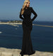 Woman in a black dress standing by the ocean with a clear blue sky.