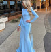 Woman in a blue evening gown standing by the ocean with boats in the background