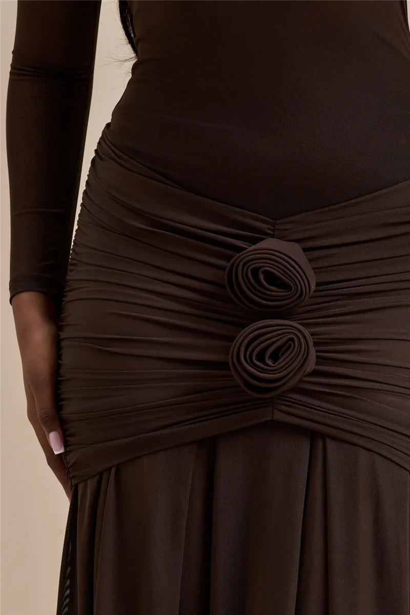 Absolutely. The rose detailing, elegant draping, and bodycon fit make it ideal for galas, weddings, evening dinners, and red-carpet moments.