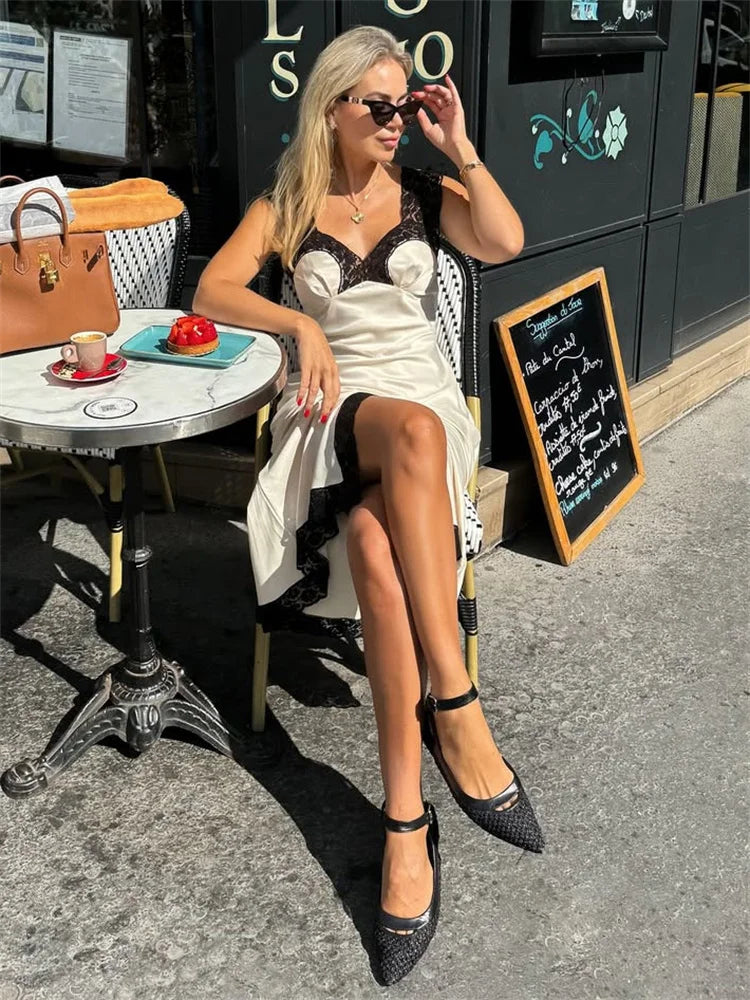 Patchwork black-and-white satin enhanced with delicate lace detailing