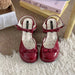 Red high-heeled shoes worn with white socks and a black floral dress on a textured surface.