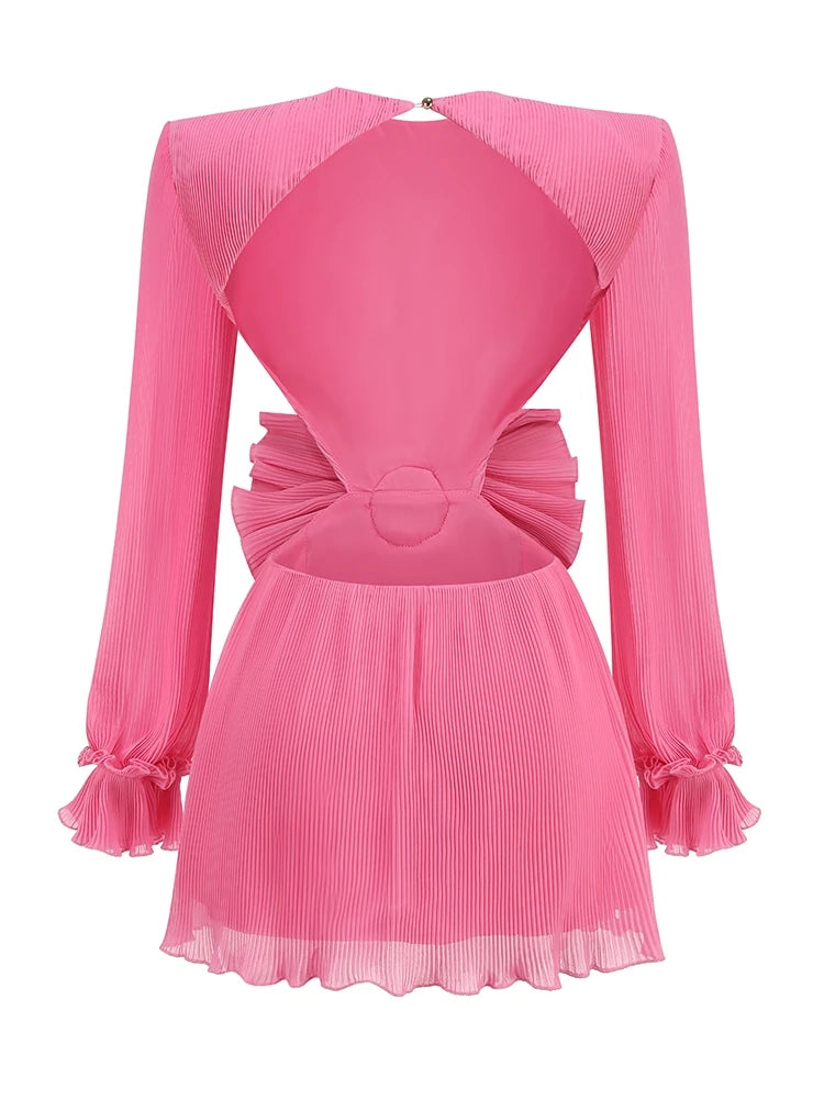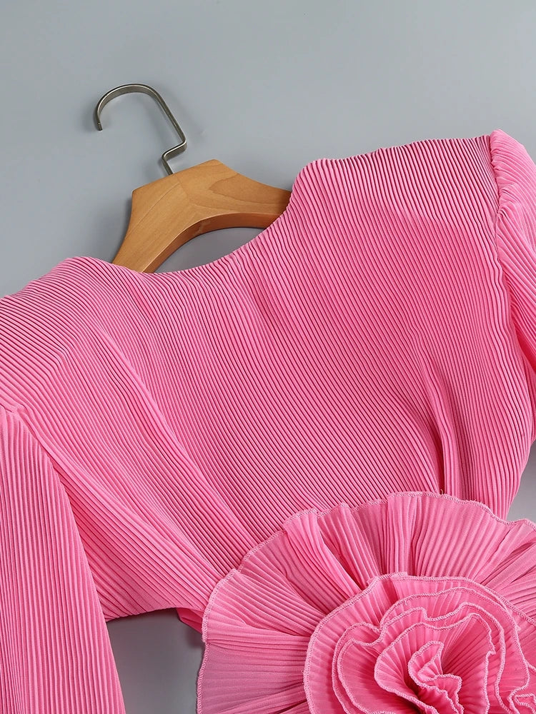 Bold yet softly feminine, this pink mini dress plays with structure and fluidity. The full-length sleeves balance the playful cutout at the waist, while the sculpted appliqué flower blooms like a handcrafted corsage, creating dimension and movement without losing its refined shape. It feels like wearing modern romance — sculpted, graceful, intentionally sweet.