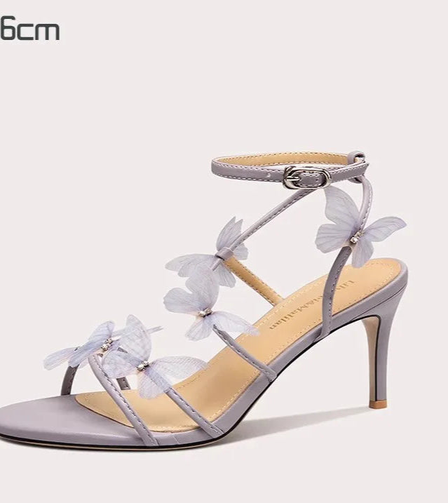 Bring whimsical elegance to warm-weather celebrations with these pink stiletto sandals, decorated with airy butterfly-knot bows and three-dimensional floral appliqué. A slim super-high heel, open vamp, and delicate buckle strap deliver feminine glamour and comfort—perfect for weddings, garden parties, or evenings out.
