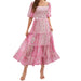 Embrace summer in the prettiest way possible with this pink floral midi dress, featuring dreamy tiered ruffles and a romantic empire waist. Styled with a softly squared neckline and breezy short sleeves, this regular-fit dress creates effortless movement—perfect for picnics, brunches, and sun-filled days. Whether you’re searching for a floral dress with volume or a playful picnic-ready look, this piece answers with comfort and charm.