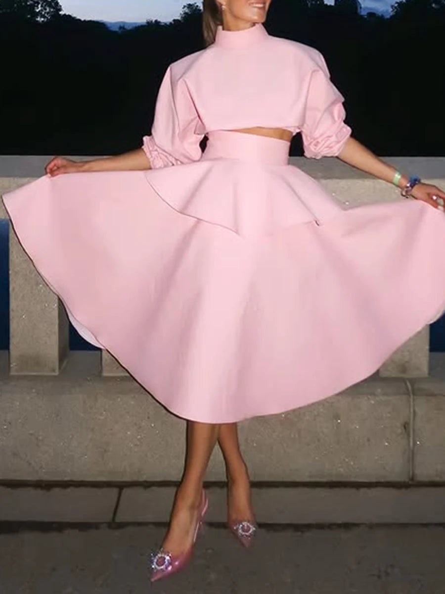 Refined and romantic, this Pink High Neck Two-Piece Set brings soft structure to seasonal dressing. Featuring a slim-fit long sleeve top with a high stand collar and a sculpted cropped length, paired with a flowy high-waist ruffle midi skirt, this coordinated outfit blends polished femininity with modern tailoring. Made from a breathable woven cotton-polyester blend, the fabric offers a crisp shape without losing movement. The zipper closures ensure a sleek silhouette, while the ruffle detailing at the skirt adds a playful yet graceful touch. Whether styled for brunches, creative workspaces, wedding guest moments, or content shoots, this set delivers statement minimalism with a pastel twist.